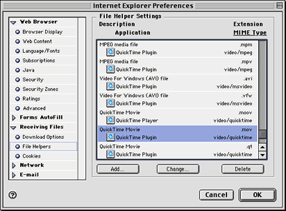 Netscape Users: In Netscape (Edit > Preferences > Navigator > Applications). There should be an entry for "QuickTime Movie" and it should be "MIME Type: video/QuickTime" and "Handled by: Plug-in" Internet Explorer Users: Mac Users: Go up to Edit > Preferences > Receiving Files > File Helpers. Make sure the Application QuickTime Movie is set to the MIME .mov.